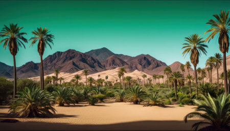 oasis, with view of towering mountain range and blue sky in the background, created with generative ai
