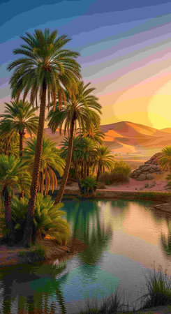 Desert oasis with date palms reflecting a tranquil sunset in golden hues