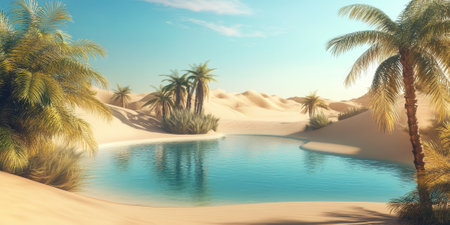 A peaceful oasis is nestled among tall palm trees, reflecting the bright blue sky and golden sands of the arid desert. Sunlight bathes the area in a warm glow, creating a tranquil escape.