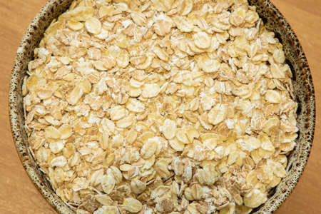 healthy food photography background raw oat meal in bowl on unfocused wooden table background