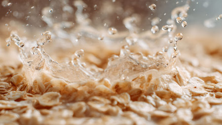 Close-up of water splashing into a bowl of oatmeal. Healthy food concept with natural ingredients for breakfast.