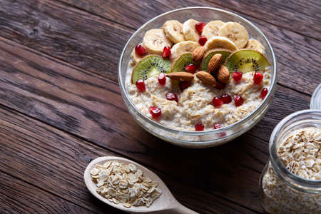 Diet breakfast oatmeal cereal with kiwi, banana, almond and pomergranate seeds and wooden bowl and spoon with oat flakes over vintage wooden background, selective focus, close-up, top view. Healthy eating concept. Breakfast background.