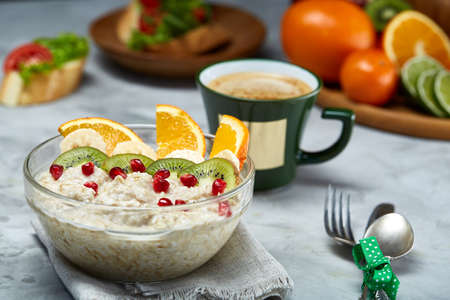 Oatmeal porridge with fresh berries, orange and kiwi in a bowl