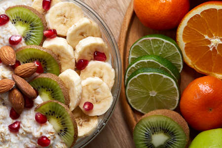 Bowl with oatmeal flakes served with kiwi, lime, lemon, orange, tangerin, apple and pomergranate on wooden tray over rustic wooden background, flat lay, selective focus. Healthy breakfast concept. Nutritious and diet snack.