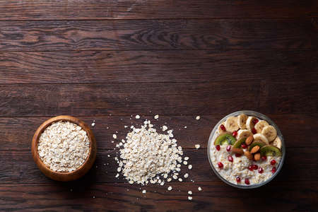 Diet breakfast oatmeal cereal with fruits, wooden bowl with oat flakes and oatmeal pile in between over vintage wooden background, selective focus, close-up, top view. Healthy eating concept. Breakfast background.