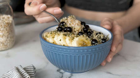 Fitness woman eating vegan oatmeal porridge with banana, hemp seeds and berries for a healthy breakfast. Sustainable eating, healthy lifestyle concept