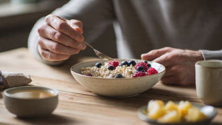 A person sits at a wooden table, eating oatmeal with blueberries and raspberries, accompanied by a cup of coffee and sliced fruit, in a cozy morning setting.
