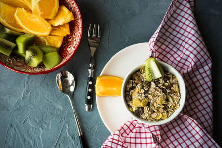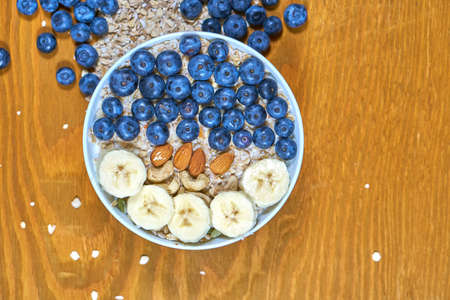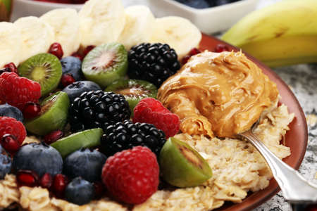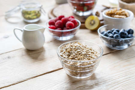 Healthy breakfast concept with oat flakes, fruits, nuts, berries, seeds