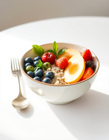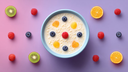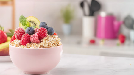 A vibrant breakfast bowl filled with creamy oatmeal topped with fresh berries and kiwi in a bright kitchen. Perfect for healthy meal inspiration.