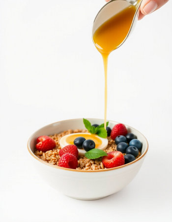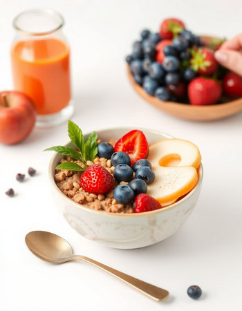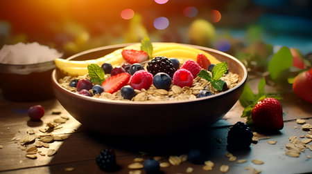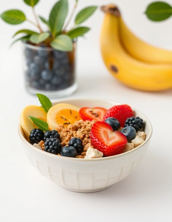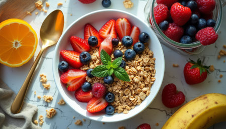 A vibrant breakfast bowl filled with crunchy granola, juicy strawberries, blueberries, and a sprig of fresh mint, surrounded by citrus and berries. This delightful scene captures the essence of a healthy morning, inviting you to savor the freshness and energy of a nutritious start.