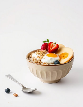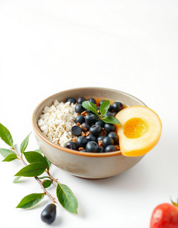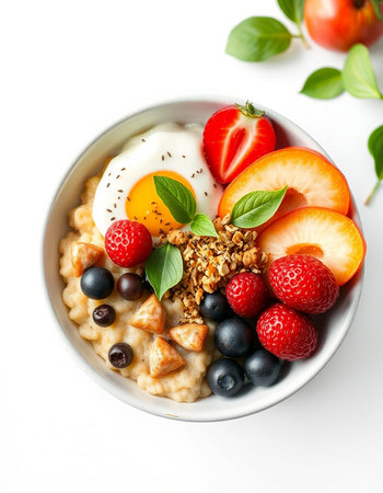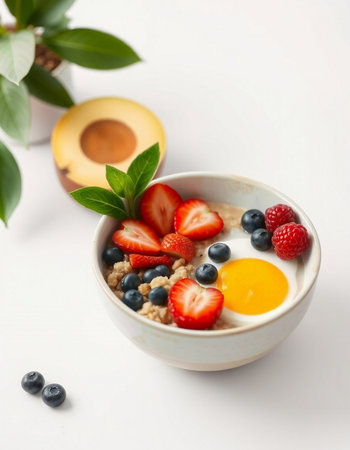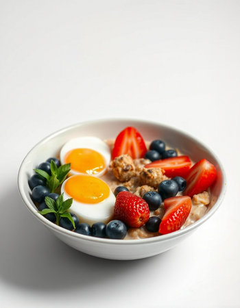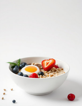 Healthy breakfast bowl with oatmeal, berries and eggs on white background