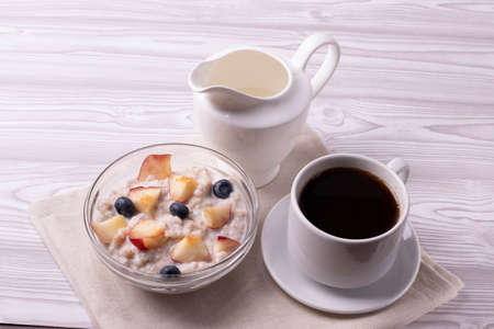 Breakfast still life with oatmeal porridge, fruits and coffee cup, top view, selective focus, shallow depth of field.