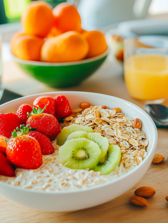 Oatmeal with kiwi, apples, almonds and blueberries. Amended orange juice in a glass, croissant and fresh fruits. A healthy breakfast on a light table, top view