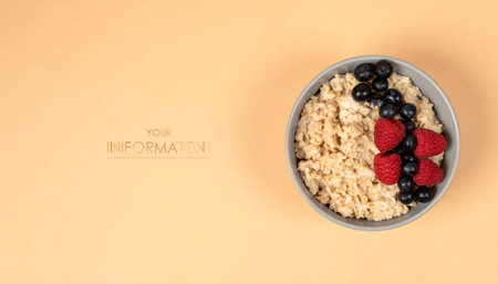 Delicious oatmeal porridge with raspberries and blueberries in a bowl on a peach background