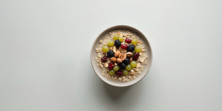 AI Generated. Healthy bowl of oatmeal with dried fruits and nuts promoting diabetes awareness featuring empty space for adding custom text or messages