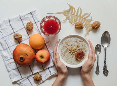 Oatmeal porridge with pomegranate, apples, oranges, pine nuts, walnuts, in a white bowl and silver spoons. Top view. Healthy breakfast.