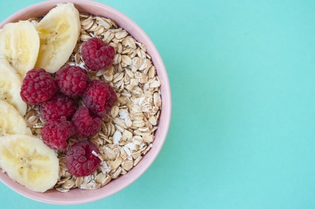Close up of oatmeal in a beautiful pink bowl with fresh sweet rasberry and banana slices on blue background.