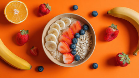A beautifully arranged breakfast bowl featuring oats topped with banana slices, strawberries, and blueberries on a vibrant orange surface.
