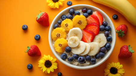 A vibrant bowl filled with oatmeal and a colorful assortment of fresh fruits creates a perfect healthy breakfast. Bright strawberries, blueberries, and bananas complement the appealing arrangement, surrounded by cheerful sunflowers on a striking orange background.