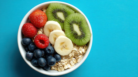 This vibrant image features a bowl of oatmeal topped with fresh strawberries, blueberries, banana slices, and kiwi, ideal for healthy meal inspiration.