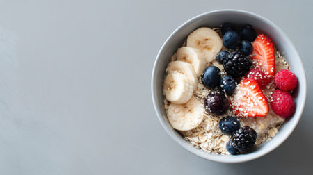 A beautifully arranged bowl of oats topped with fresh banana slices, strawberries, blueberries, and raspberries. Perfect for a healthy breakfast!