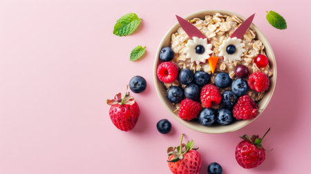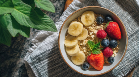 A vibrant breakfast bowl featuring oats topped with fresh fruits like bananas, berries, and nuts, showcasing a healthy morning meal choice.