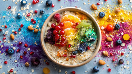 A vibrant bowl of healthy oatmeal topped with fresh fruits, nuts, and chia seeds, surrounded by scattered ingredients on a dark stone background.