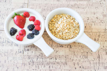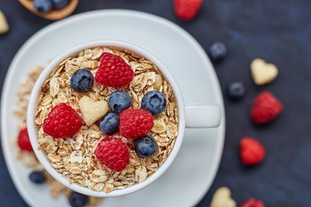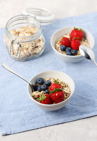 Healthy breakfast with muesli, berries and fruits, selective focus