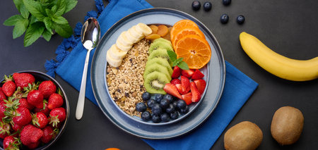 Granola with strawberries, kiwi, banana and blueberries in a round plate on a black table. Healthy and tasty food, top view