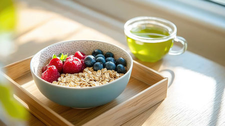 A warm and inviting breakfast scene with a bowl of granola, fresh fruit, and a cup of green tea, styled on a wooden tray.