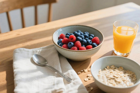 Bowl of fresh blueberries and raspberries with orange juice and oatmeal on a sunny wooden table. Bright morning light, healthy lifestyle theme, ideal for food, diet, and wellness concepts.