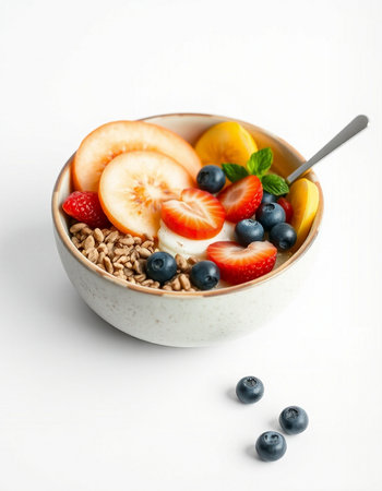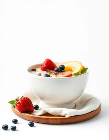 Muesli with strawberries and blueberries in a white bowl on a white background