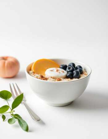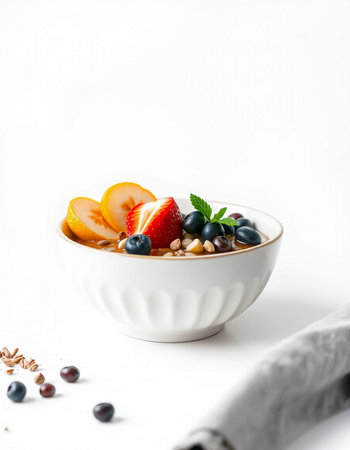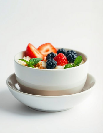 bowl of oatmeal with fresh berries on white background, healthy breakfast