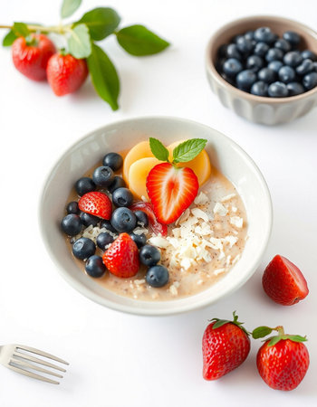 Healthy breakfast with oatmeal, berries and fruits on white background