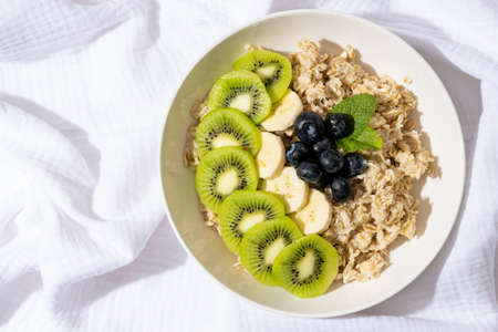 Organic food for healthy and dieting breakfast.Top view of bowl with oatmeal, fresh kiwi, blueberry on white background. top view