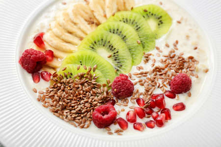 Tasty yoghurt with fruits and flax seeds in bowl, closeup