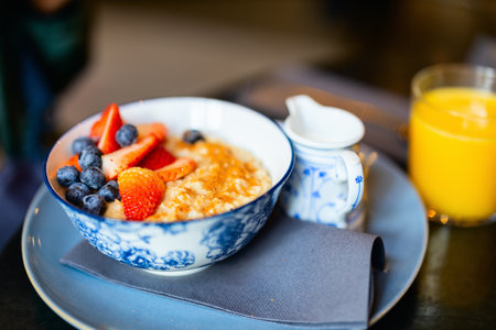 A bowl of creamy oatmeal garnished with fresh strawberries, blueberries, and a sprinkle of cinnamon, served with milk and a glass of orange juice for a wholesome breakfast.
