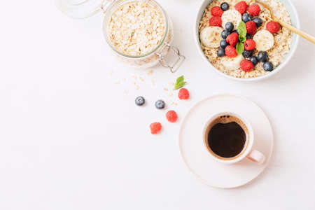 Coffee and homemade oatmeal with raspberries, blueberries, banana and chia seeds on white table. Healthy breakfast. Top view, flat lay, copy space.