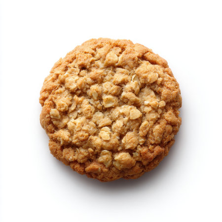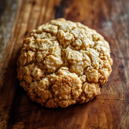 This image showcases a delectable oatmeal cookie featuring a crunchy texture and golden color. Perfect for dessert or a wholesome snack.