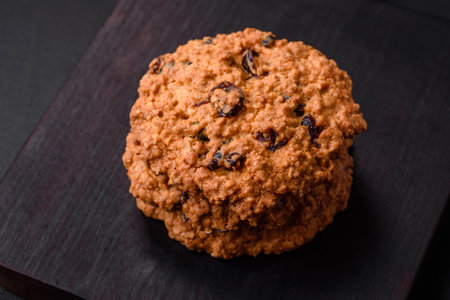 Delicious baked oatmeal raisin cookies on a dark concrete background. Sweets for breakfast