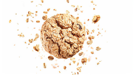 Multiple oatmeal cookies mid-air on a white background, capturing their texture and freshly baked charm.