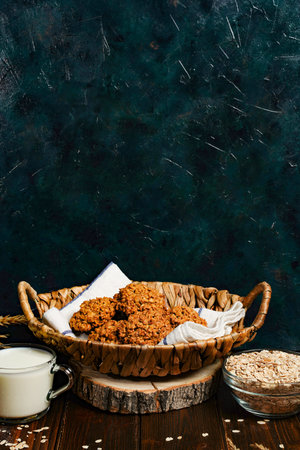 Homemade oatmeal cookies on dark background with oat flakes and milk cup. Healthy Food Snack Concept. Copy space