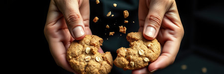 Hands breaking an oatmeal cookie in a dark setting capturing a moment of deliciousness and texture