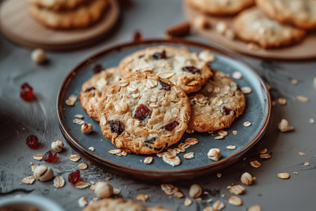 Delicious oatmeal cookies with cranberries and nuts arranged on a clean surface for a tempting snack