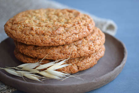Oatmeal cookies and ears of corn on a clay plate. Delicious and healthy Breakfast.