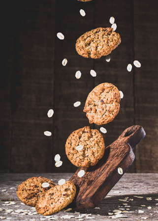Chocolate oat cookies surrounded by flying grains and oats, creatively styled to capture the energy and rustic charm of wholesome baking.