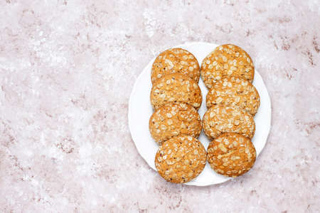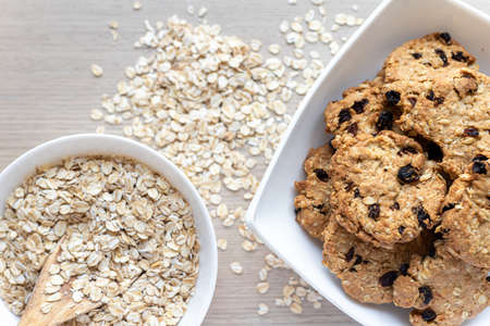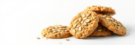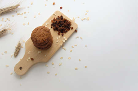 biscuits on a wooden board with oatmeal flakes on a white background, banner. High quality photo