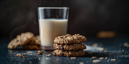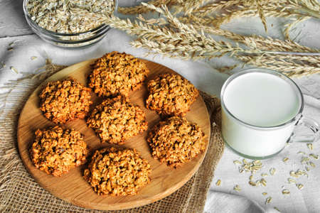 Healthy breakfast. Oatmeal cookies with milk on a wooden table