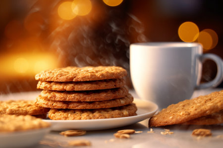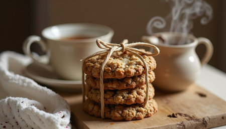 Generative AI : home made Oatmeal cookie on wooden table with a cup of tea