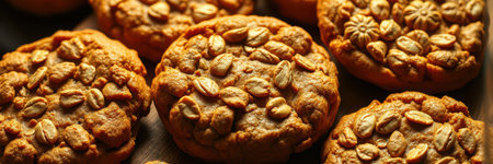 Freshly baked oat cookies arranged on a wooden surface with intricate designs on top
